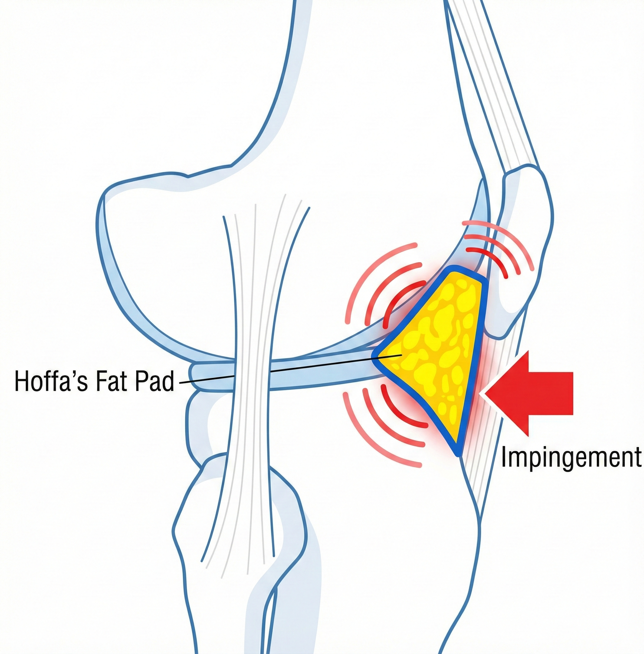 Hoffa's Fat Pad는 경골(Tibia)의 전방부와 반월상 연골판에 단단히 고정되어 있습니다. 만약 경골이 대퇴골(Femur)에 대해 과도하게 앞으로 밀려나가는(Translation) 동작이 발생하면, 지방패드는 대퇴골의 관절면(Condyle)과 마찰을 일으키며 '쓸리는(Shearing)' 스트레스를 받습니다.
